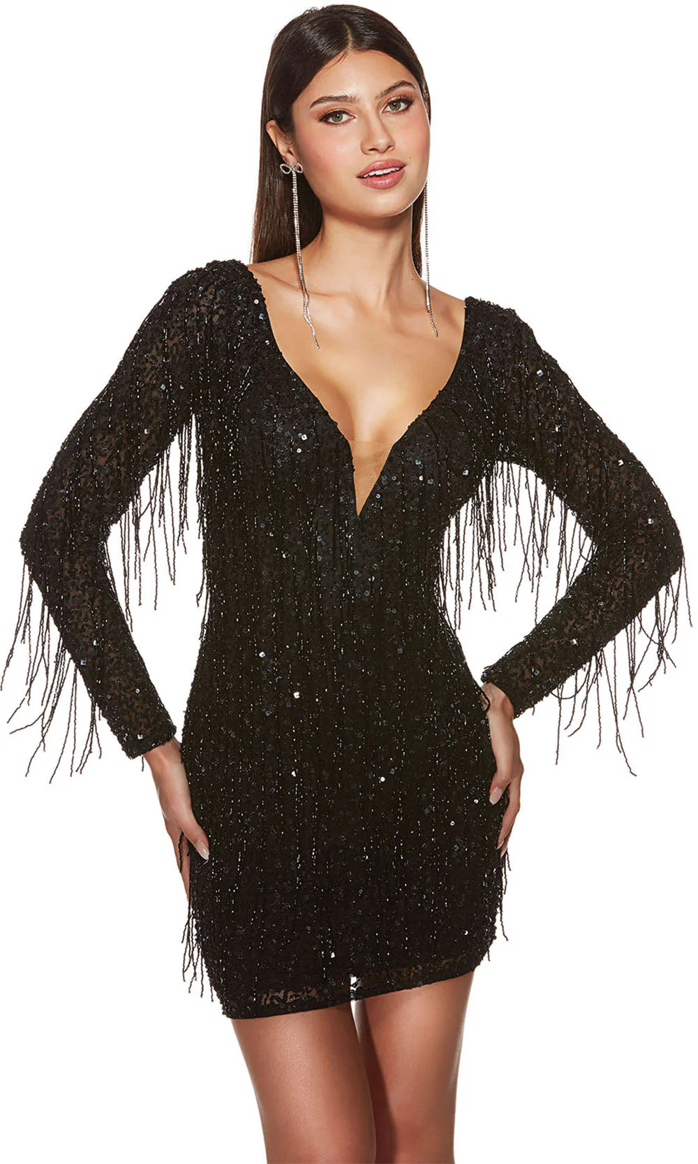 Prepare to captivate the crowd and command attention in this glamorous Alyce Paris 4873 cocktail dress. The endearing plunging V-neckline on the fitted bodice, complemented by charming long sleeves that lend sophistication, will beautifully accentuate your natural beauty. The alluring scoop back, enclosed by a concealed zipper for a polished finish, adds an enticing touch that heightens the allure. The sheer inset on the chest creates a captivating contrast, while the sleek sheath silhouette skirt, evident down to the mid-thigh, exudes elegance and refinement. Meticulously adorned with fringes and beads, this masterpiece elevates your overall appeal, allowing you to take your rightful place as the center of attention. As you grace the room in this stunning Alyce Paris 4873 creation, you will radiate confidence and queenly presence, leaving a lasting impression on all who lay eyes on you. Models are wearing Black, Emerald, and Sangria colors.