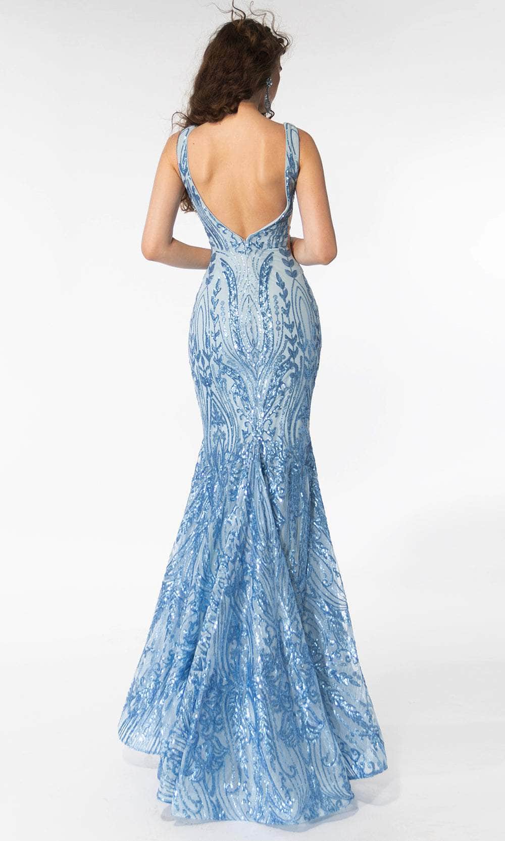 Exude sheer opulence in the resplendent Ava Presley 39204 creation. Crafted to accentuate the feminine silhouette, this gown displays a breathtaking array of intricate sequins adorning its entirety. The sleeveless bodice showcases a deep V-neckline, while the back boasts a striking deep V-open design complemented by a discreet zipper closure. The mermaid skirt, adorned with an exquisite cascade of sequin accents, features graceful drapes from the waist and cascades into a sweeping train at the knee. Make a lasting impression as you don this alluring Ava Presley 39204 masterpiece, capturing the attention of all in your wake. Model is wearing the Light Blue color.