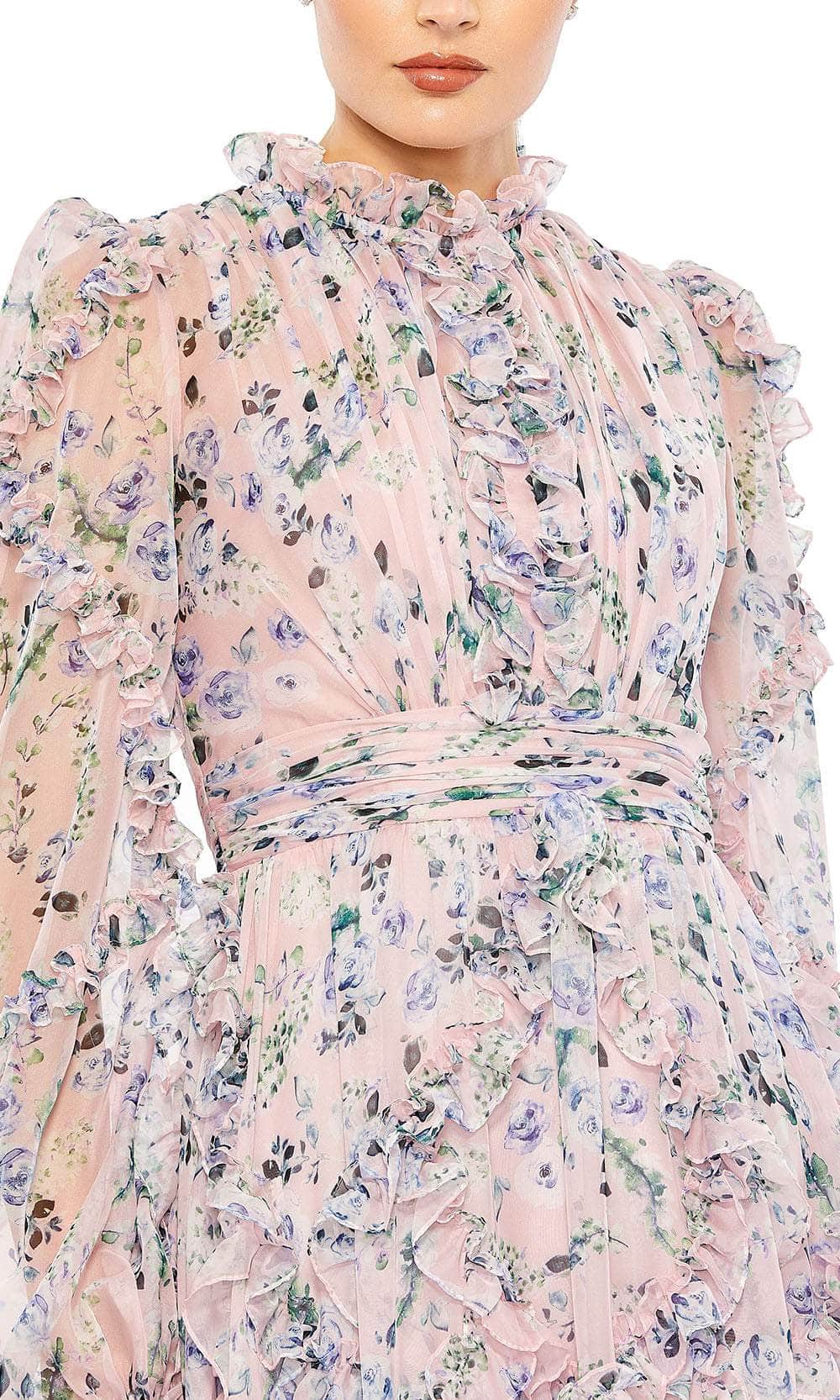 Command attention in the Mac Duggal 68232, an elegant long puff sleeve gown made from luxurious chiffon fabric embellished with a captivating floral print. The dress boasts a textured and elegant rushed bodice, complemented by a gracefully cinched waist with a cummerbund. The tiered skirt adds a dynamic and stylish touch. With a concealed back zipper ensuring a seamless fit, and a full back completing the look with sophistication, the Mac Duggal 68232 epitomizes romantic charm and contemporary style. Model is wearing Blush Multi color.
