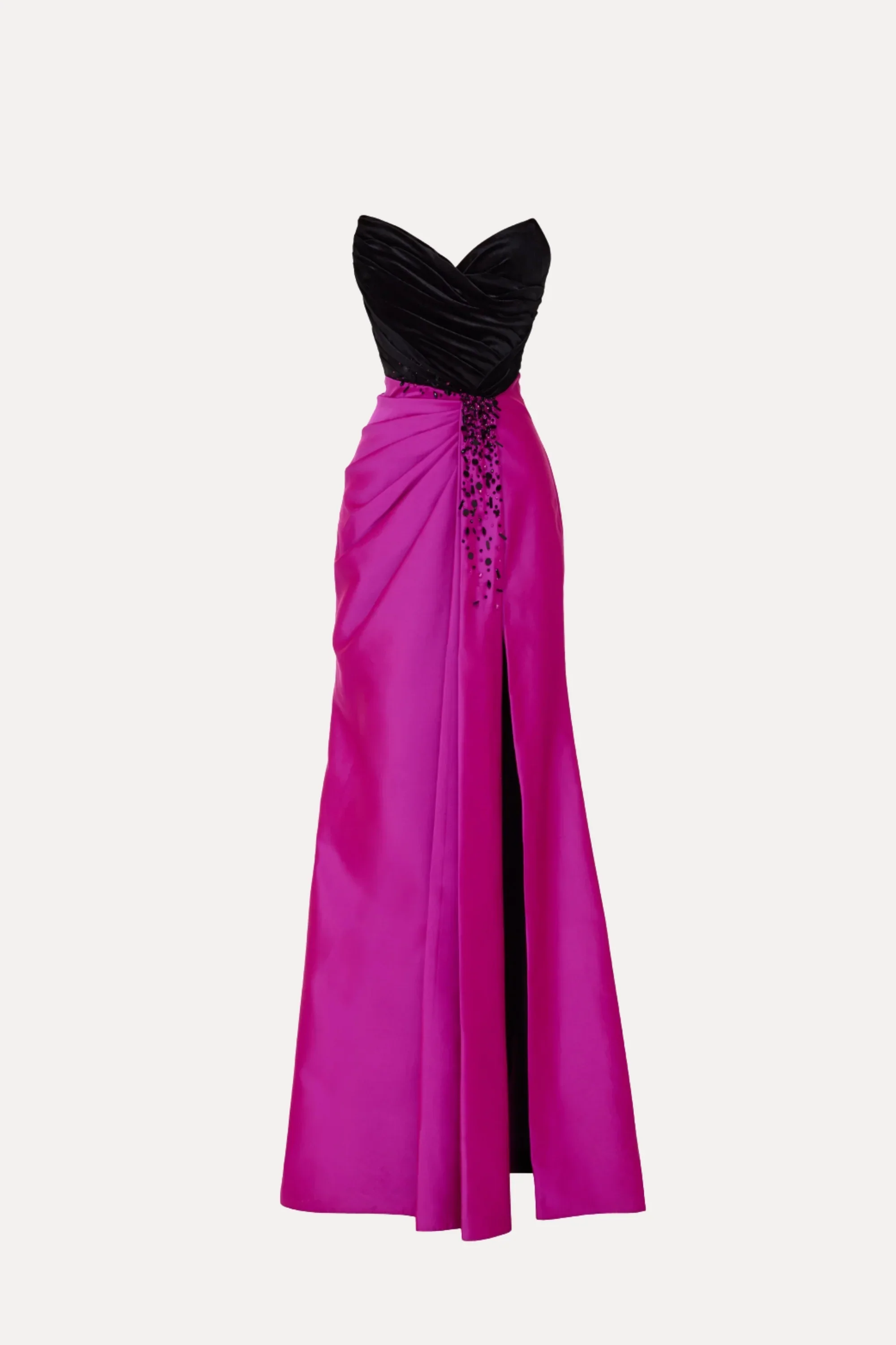 Tarik Ediz 98793 is a gown that radiates refined drama and timeless allure. The strapless peaked V-neckline unveils the décolletage with bold sophistication, while the black velvet bodice is sculpted with artful pleating that contours the waist in flawless precision. A contrasting skirt shimmers with beadwork along the waistline, its gathered pleats shaping the hips before revealing a daring front slit. Flowing into a soft A-line silhouette, the skirt balances structure with graceful movement. Tarik Ediz 98793 is a statement of elegance and modern glamour, perfect for galas, soirées, or red-carpet occasions. Models are wearing Black/Fuchsia, and Black/Royal Blue variants.